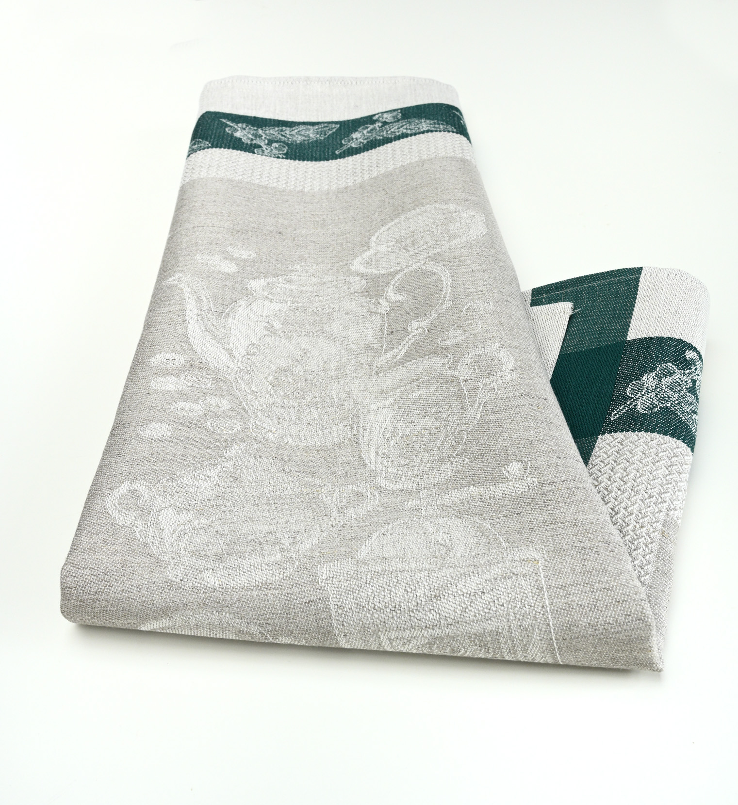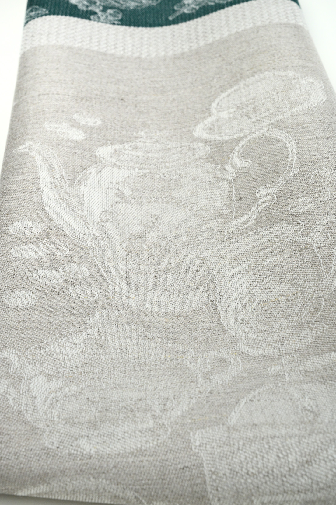 Our Coffee themed tea towel is a beautiful damask woven kitchen towel. Dark green borders frame the coffee design and contrasts nicely with the natural background.
